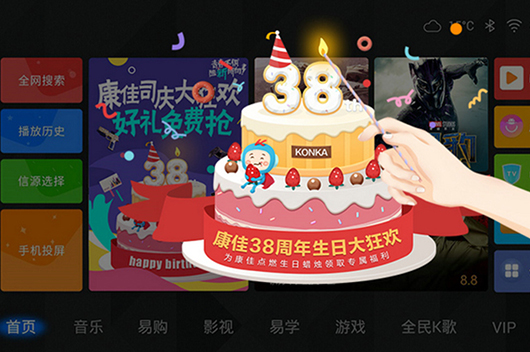 ? 本次康佳38周年慶的活動涵蓋新玩法、新任務、新時代三大創意“新”亮點。在TV端,首次嘗試與用戶深入互動的全新玩法,邀請每一位電視用戶為康佳點亮生日蠟燭,隨后參與重磅抽獎,簡單的操作背后體現的是康佳互聯網事業部團隊的滿滿創意。還通過搭建TV生日專區為用戶送福利,分享康佳生日大禮包,吸引全家人的積極參與,史上最強的回饋用戶福利瞬間掀起全民狂歡,成就了上千萬家庭的娛樂新方式。