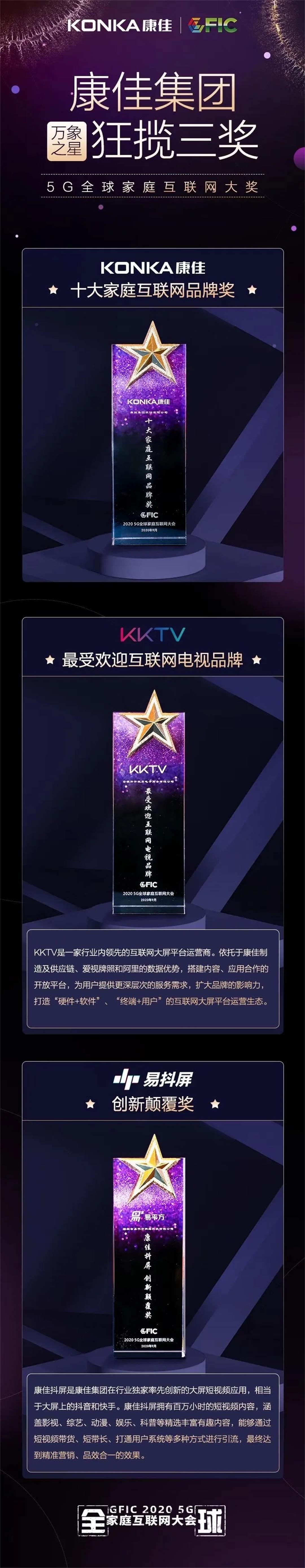 ? 此次集團及旗下KKTV與易抖屏的獲獎,充分體現出業內對于康佳集團在家庭互聯網領域創新引領能力的認可與期望。未來,康佳集團也將繼續深耕智能互聯領域,在致力為消費者創造美好智慧生活的同時,持續賦能萬物互聯生態體系。