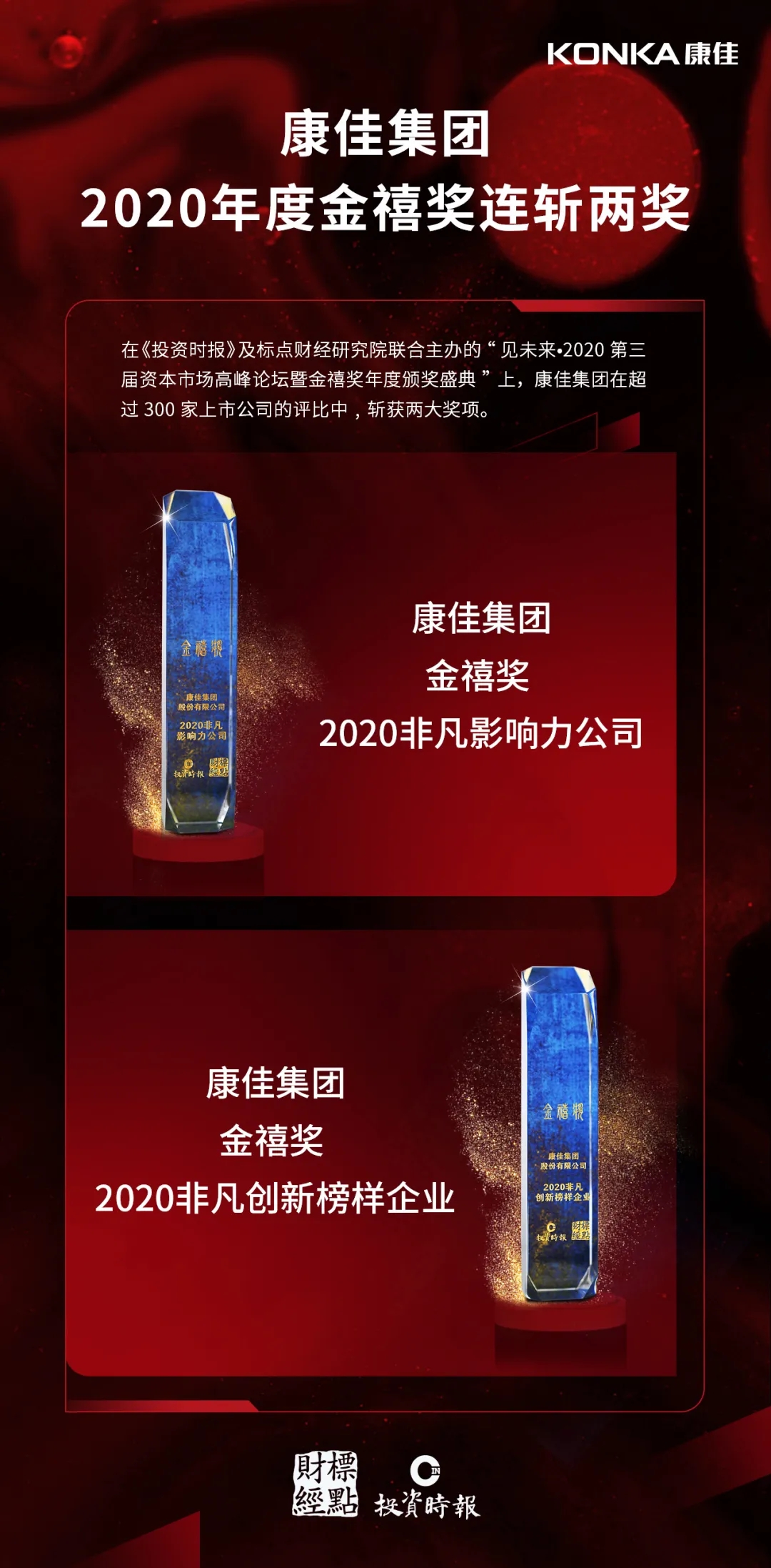 ? 近日,在標點財經研究院聯合《投資時報》主辦的“見未來?2020第三屆資本市場高峰論壇暨金禧獎年度頒獎盛典”上,康佳集團斬獲“金禧獎2020非凡影響力公司”、“金禧獎2020非凡創新榜樣企業”雙獎;此外,憑借在互聯網領域的優秀科技創新成果,康佳集團在眾視Tech主辦的“GFIC2020 5G全球家庭互聯網大會”上狂攬“十大家庭互聯網品牌獎”、“最受歡迎互聯網電視品牌”以及“創新顛覆獎”三項大獎。