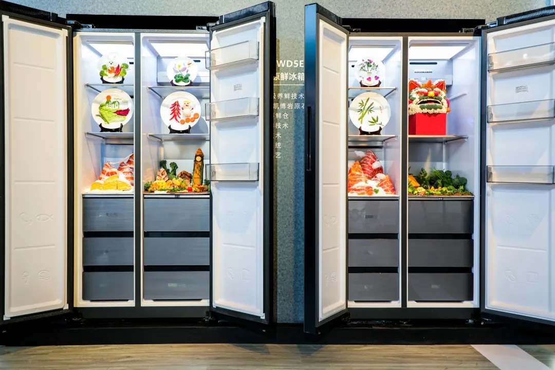展會現場,康佳15天生態原鮮冰箱BCD-590WD5EBRP全新亮相,該款產品突破了傳統冰箱金屬與玻璃的取材,創新采用四層礦石融合而成的凱博巖原石面板,經過101道工序和2000°C高溫鍛造,鑄就雅致大氣的高端品質。