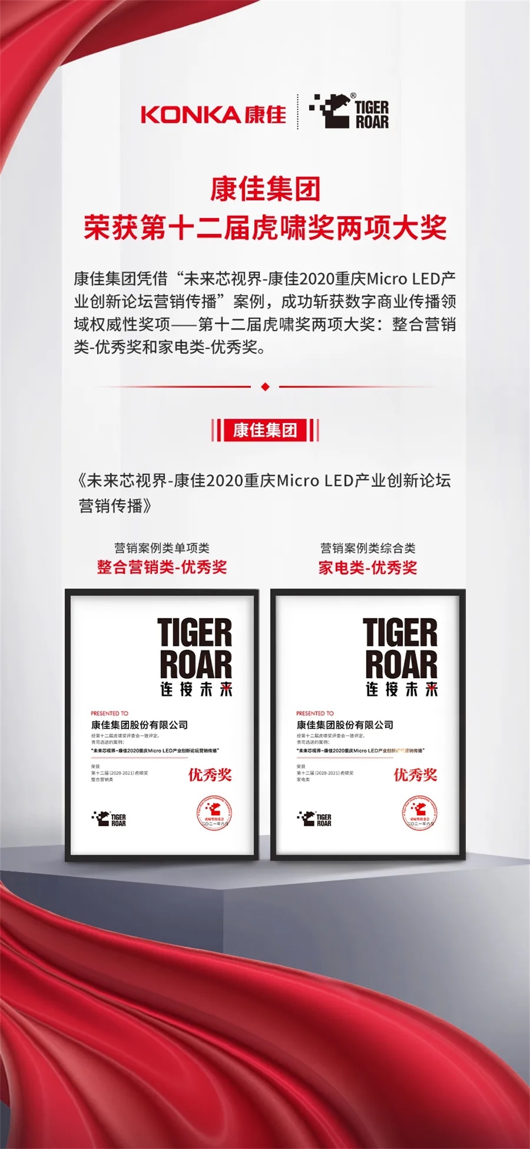 2021年6月4日,以“連接未來”為主題的第15屆中國數字商業傳播論壇暨第12屆虎嘯獎頒獎典禮在上海寶華萬豪酒店舉行。康佳集團憑借案例《未來芯視界-康佳2020重慶Micro LED產業創新論壇營銷傳播》,在數字營銷上的創新突破,一舉斬獲營銷案例類-整合營銷類優秀獎、營銷案例類-家電類優秀獎兩個獎項。