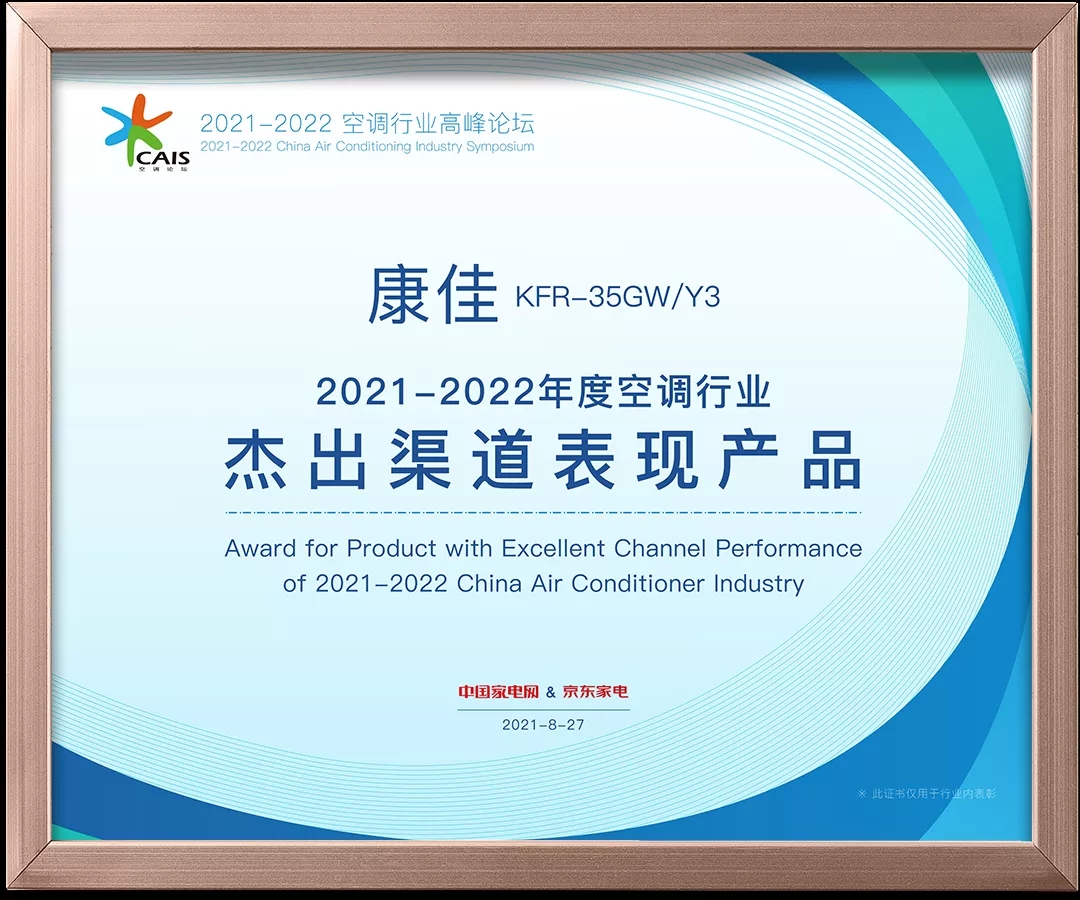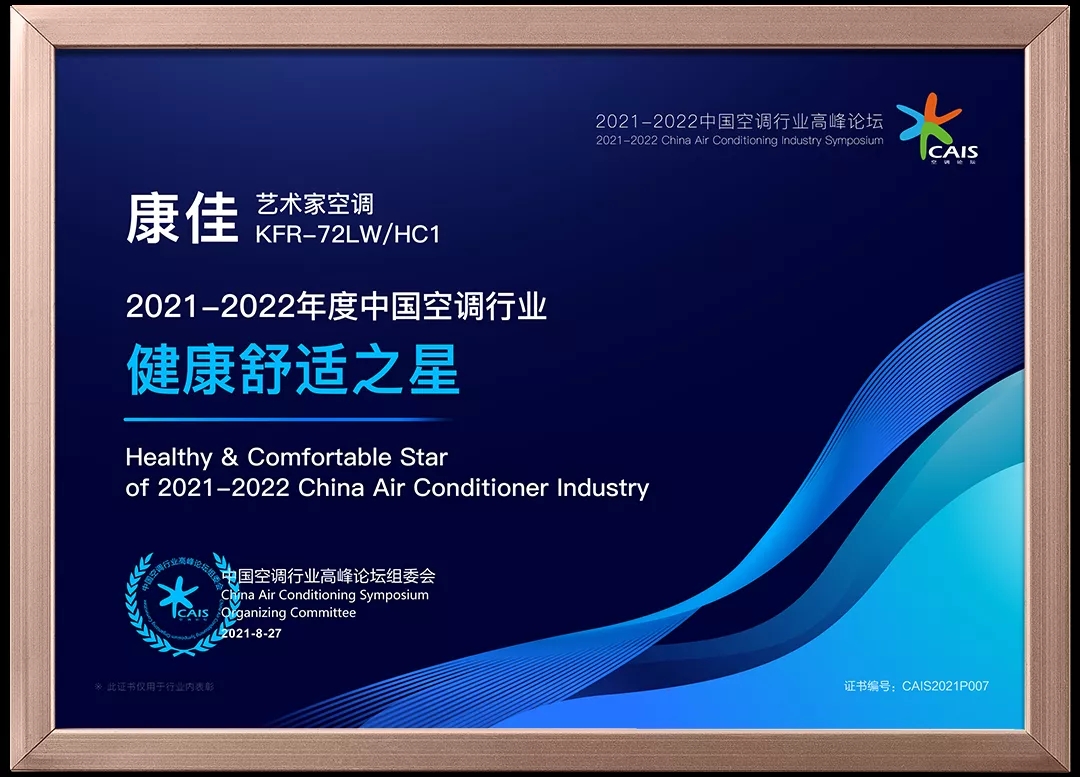 8月27日,由中國家用電器協會、國家信息中心信息化和產業發展部指導的,中國家電網主辦的“新空氣 新‘碳’索 新紅利2021-2022中國空調行業高峰論壇”于北京舉行。業內眾多企業齊齊亮相,康佳空調憑借健康、舒適、智能等方面的產品優勢在眾多空調品牌中脫穎而出,旗下藝術家空調KFR-72LW/HC1榮獲“健康舒適之星”獎,掛機空調KFR-35GW/Y3榮獲“杰出渠道表現產品”獎。