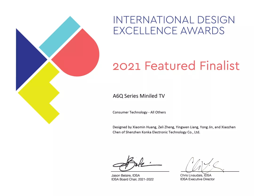 近日,在2021年度的IDEA杰出工業設計大獎中,多媒體產業本部研發中心工業設計所表現優異,憑借康佳V5 Series OLED TV和A6Q Series MiniLED TV兩款產品從全球63個國家和地區的近萬件參賽設計中脫穎而出,斬獲兩項國際設計大獎。